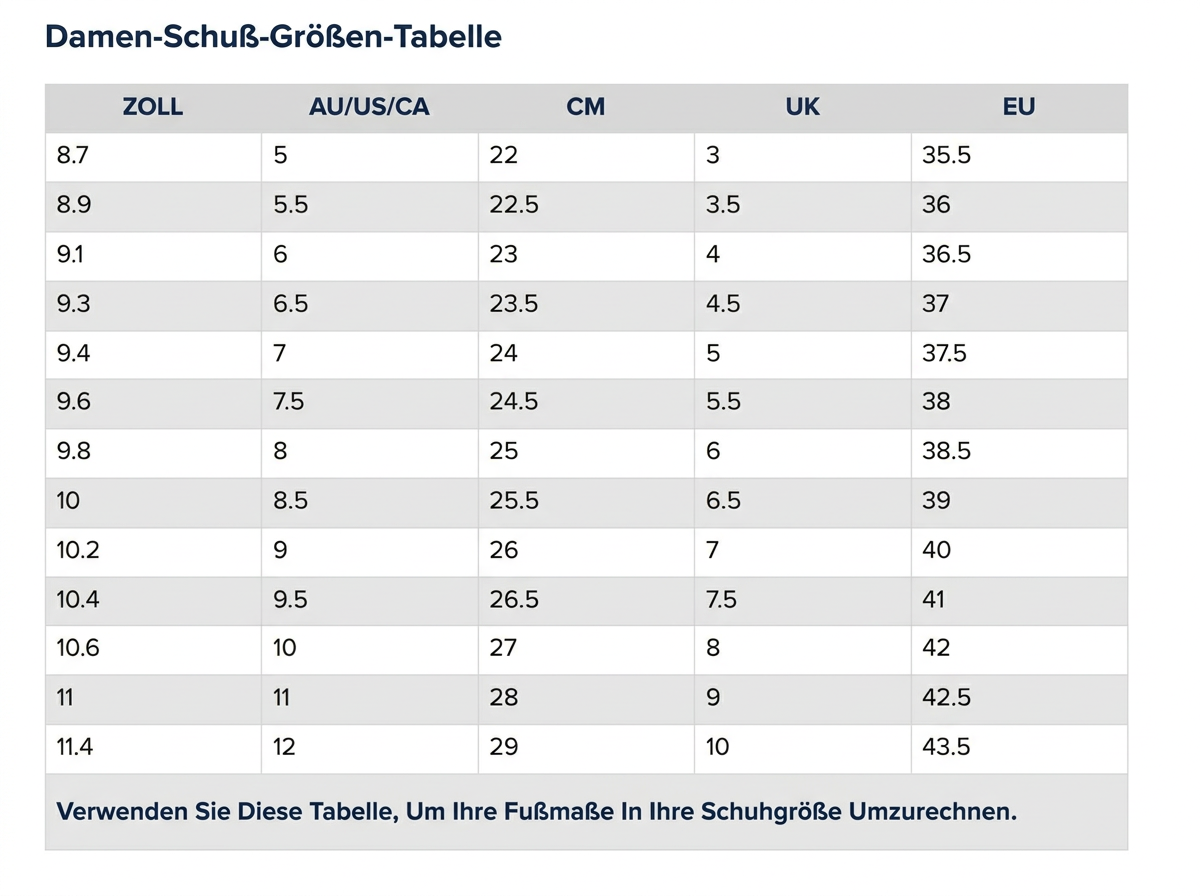 Wenn Sie breitere Füße haben oder eine lockerere Passform bevorzugen, bestellen Sie bitte eine halbe Größe größer.