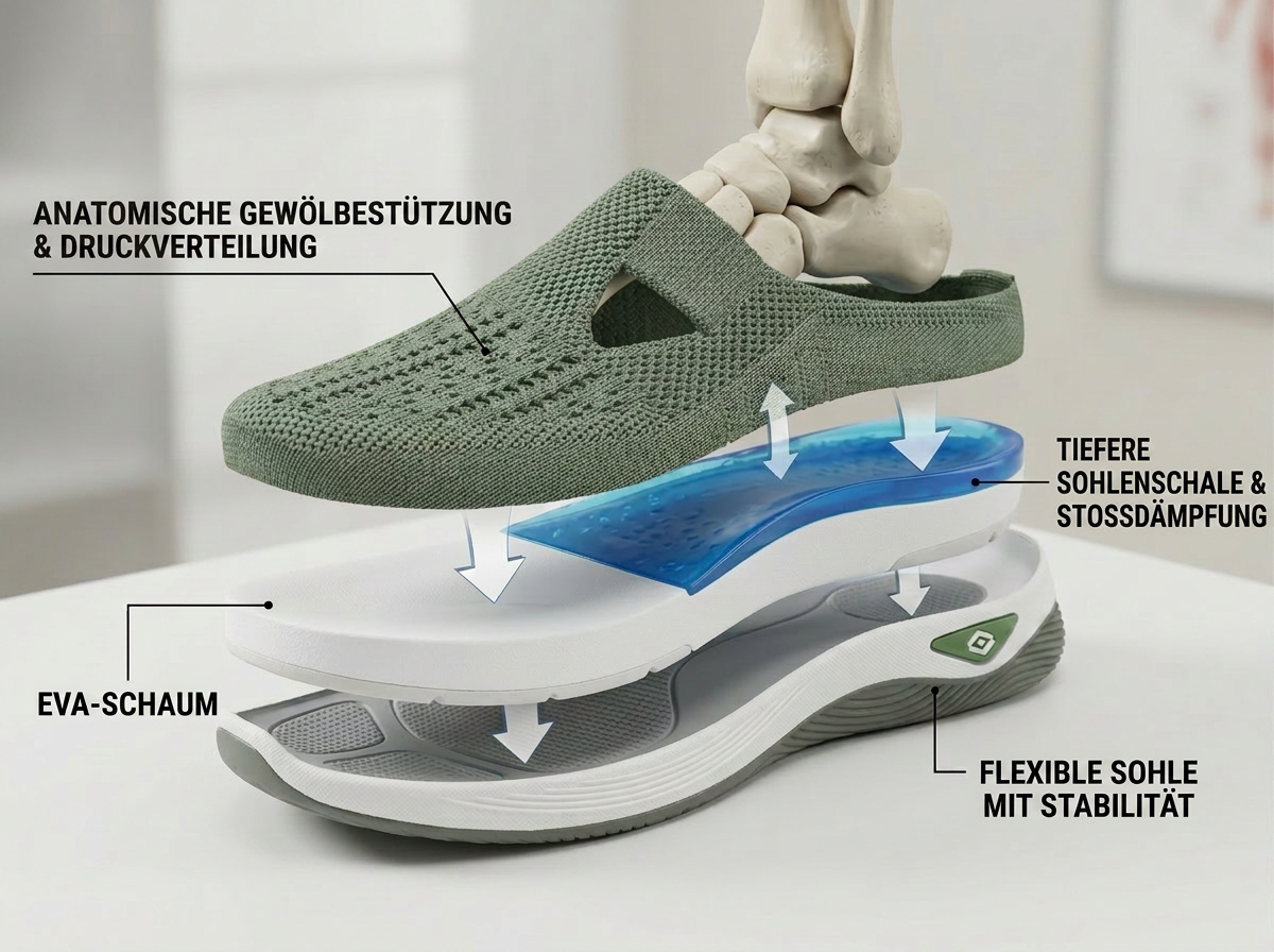 BEQUEM, PERFEKTE PASSFORM, FUSSBETTUNTERSTÜTZUNG DESIGN, LINDERT FASCIITIS PLANTARIS.