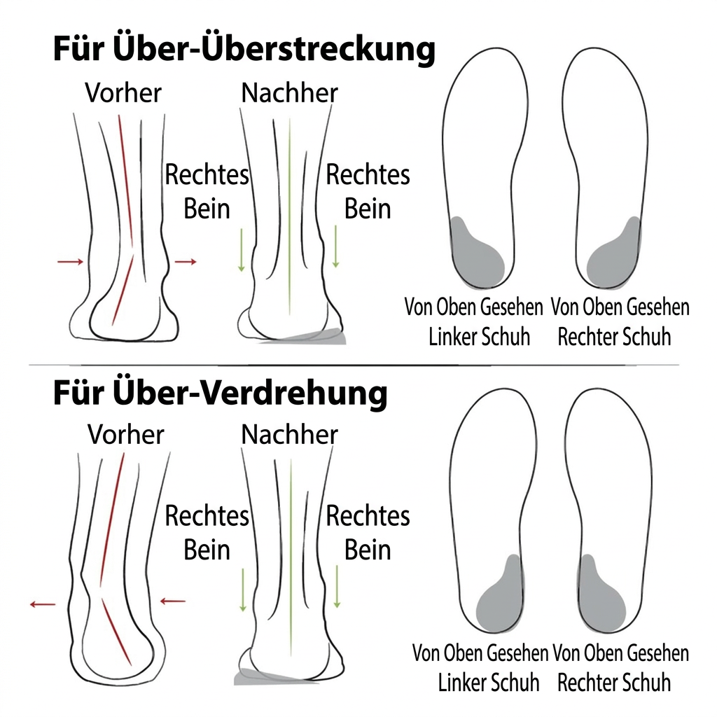 - Haltung und Korrekturen – orthopädische Einlagen stabilisieren die Ferse und üben Druck auf die nicht ausgerichteten Knochen aus, um eine Korrektur zu erreichen.